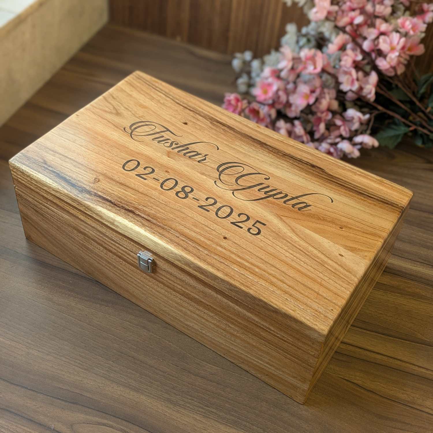 A custom wooden gift box made from our most premium wood, teak in 17 x 10 x 5 inch size. Personalize this large wooden gift box with your message, logo or photo. We can customize the size, the wood type and make wooden boxes in your size and design specifications and budget.