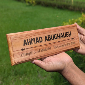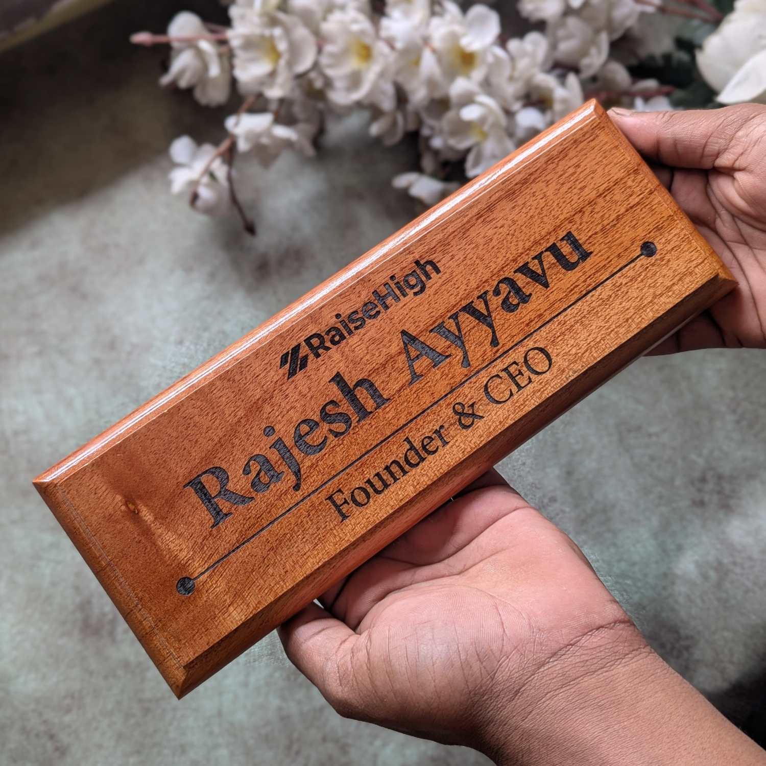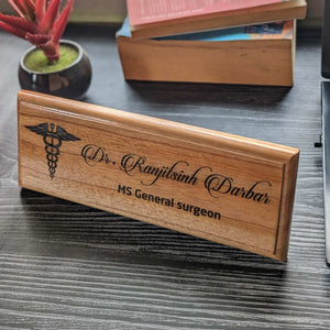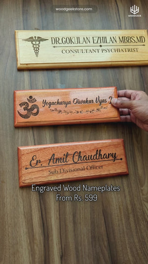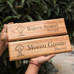 Choose from the designs shown here. Enter your name and designation and we will create a custom engraved wooden sign for you. These custom nameplate for office desk or cabin door makes the best corporate gifts. This wooden name sign can be mounted on the wall or door and placed on a table with a stand.