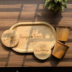 A personalized gift set with 2 name engraved wooden tea cups, a personalized tea tray with your custom engraved message and 2 wooden coasters with names or a logo engraved.