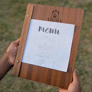 We’ve kept the design strictly functional. We craft these boards from 4mm thick solid wood, available in rich Mahogany or Golden Teak. Instead of a bulky spring clip, we use a slim wooden strip secured by polished metal Chicago screws. This setup keeps your menu sheets perfectly aligned and allows you to swap out your daily specials by simply unscrewing the bolts.