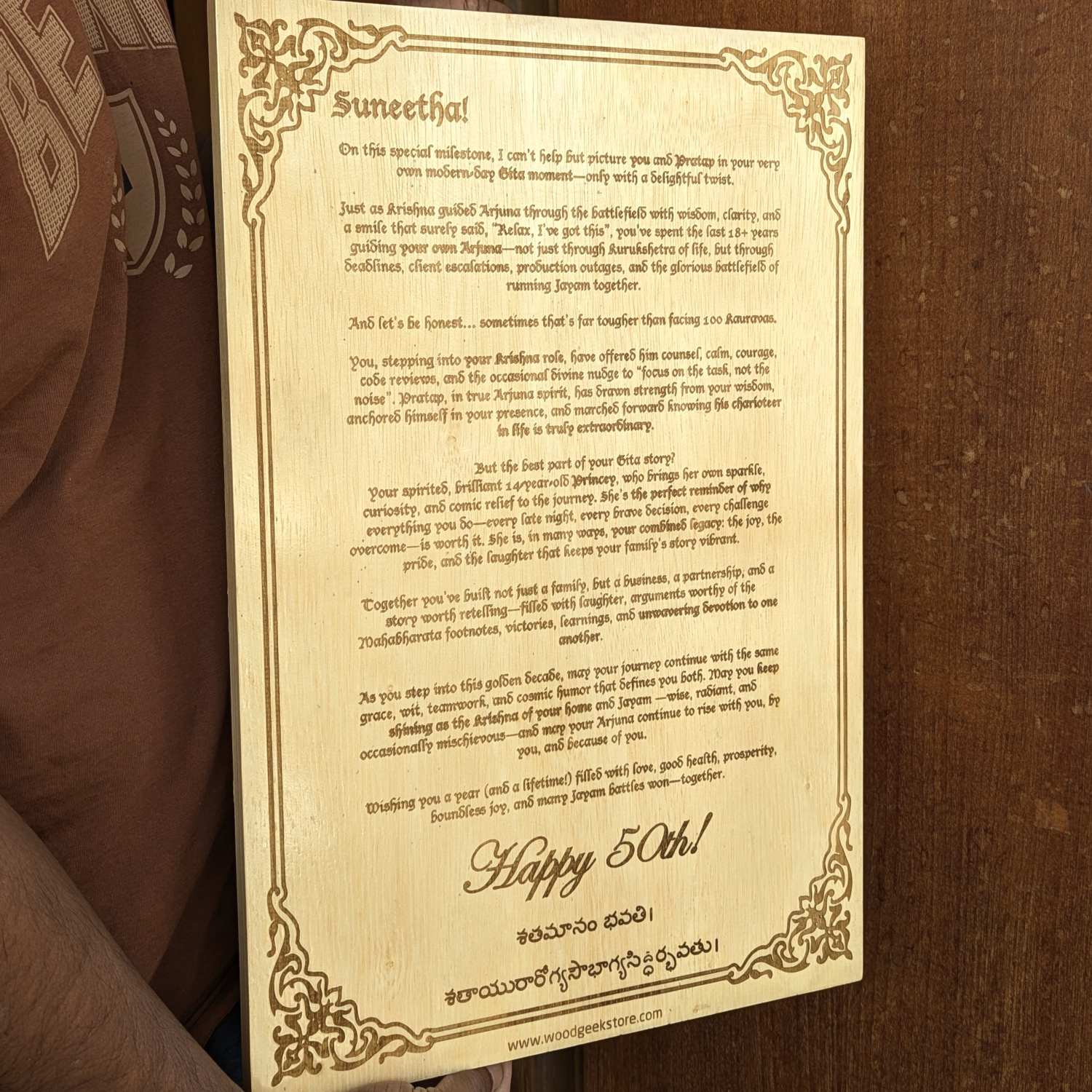 A promise this important needs to be built on something solid. You can choose the light, modern grain of Birchwood or the rich, premium feel of Mahogany. Every plaque is finished with a thick clear gloss polish, which doesn't just look high-end; it creates a protective layer that keeps the wood from warping and the text from fading over the years. We laser engrave your specific "vows" deep into the wood so that every word becomes a permanent part of the grain.