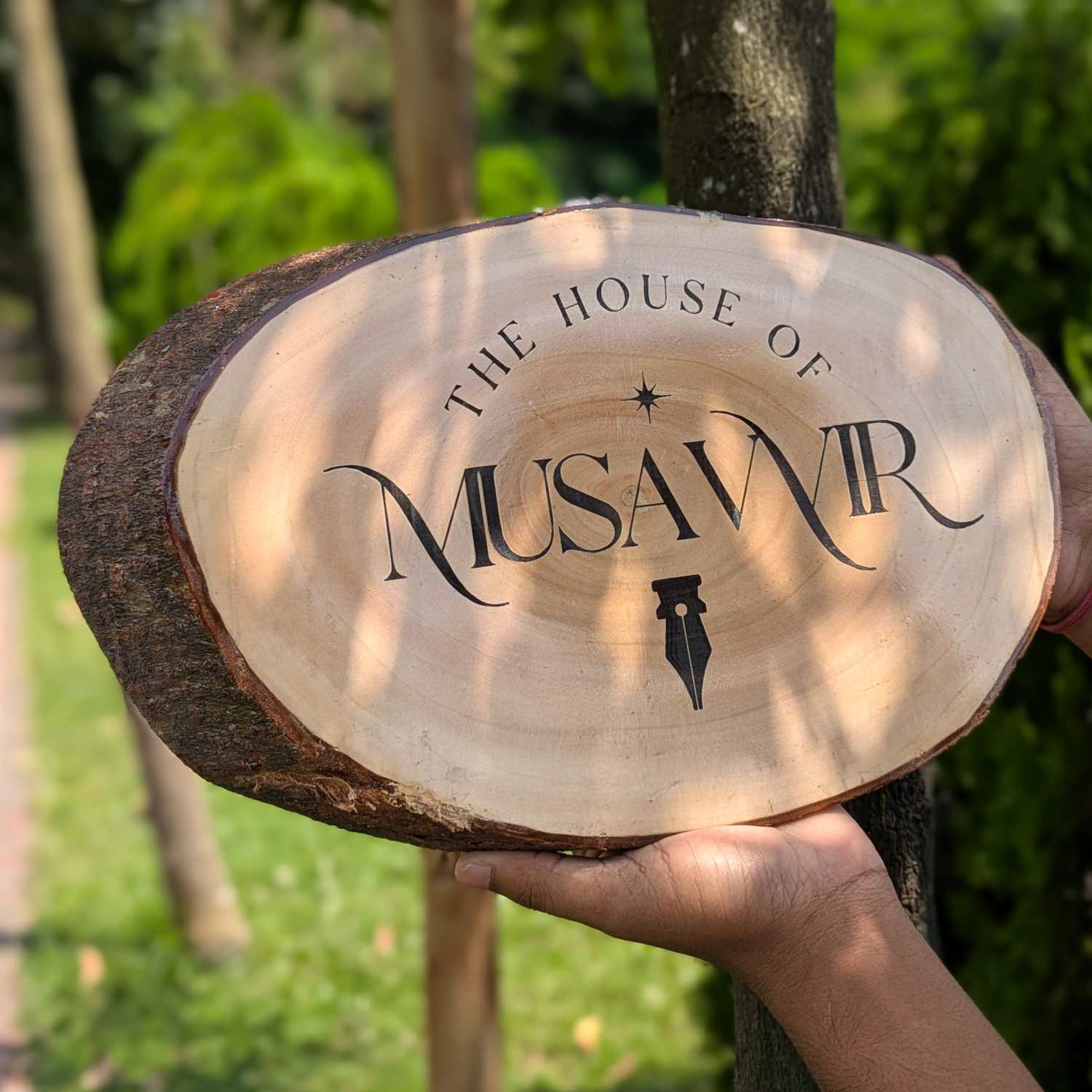 Standard office nameplates and restaurant signs are usually forgettable. This Custom Rustic Wooden Log Sign is built in our Woodgeek workshop for businesses that want to stand out. We take a solid cross-section of a tree, keep the natural bark intact, and sand the face down to a mirror-smooth finish. Since no two trees grow the same way, your company logo or cafe name will be the only one of its kind.